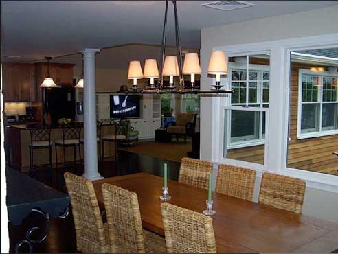 From the dining room, looking back into the kitchen and acroos the open space to the dining room with corner fireplace.